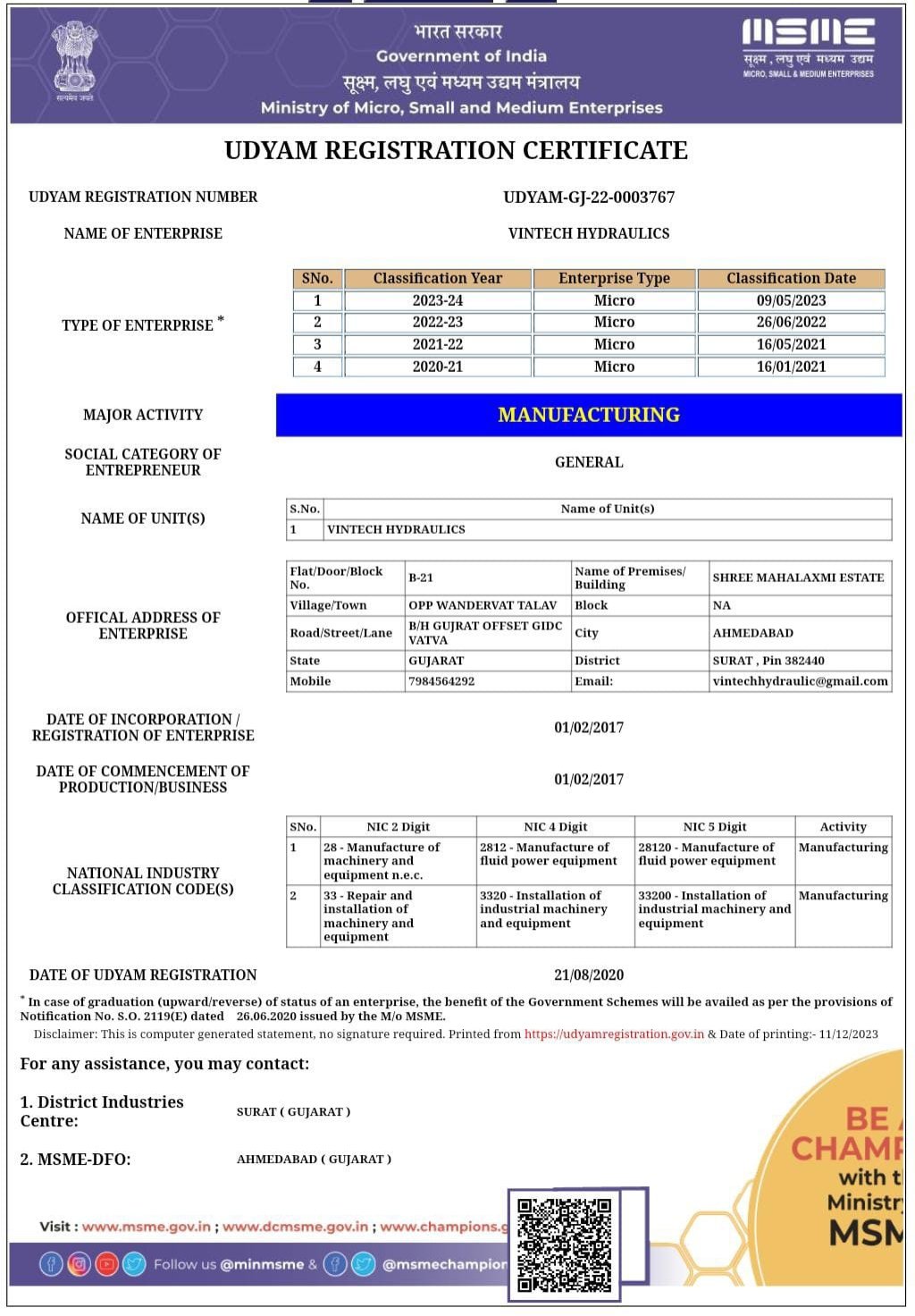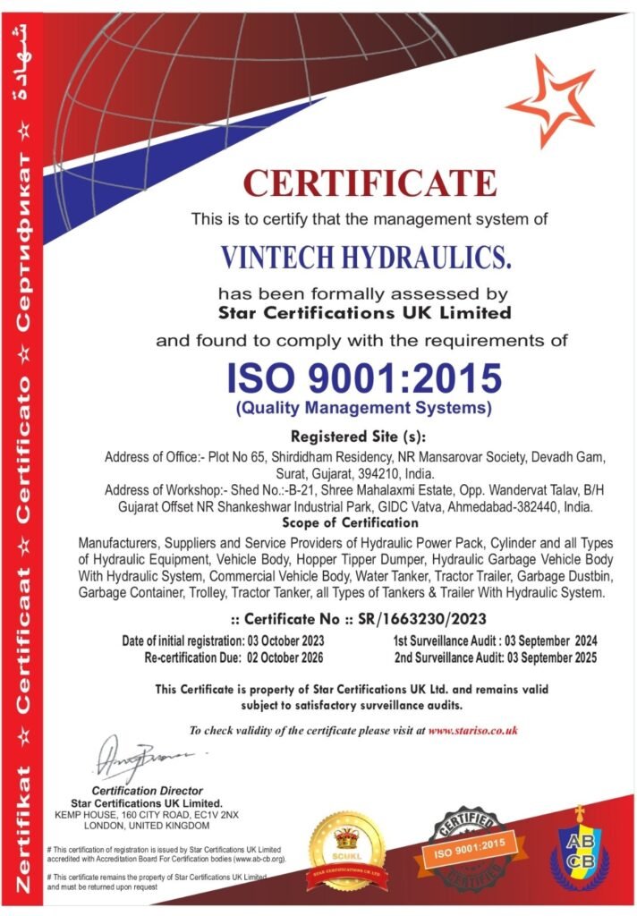 Vintech Hydraulics is a leading Manufacturer and supplier of an Hydraulic Cylinders, Hydraulic AC Power Pack, Hydraulic DC Power Pack, Hydraulic Baling Press Machine, Garbage Tipper in Ahmedabad, Gujarat, India.